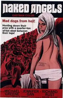Naked Angels is a 1969 American outlaw biker film directed by Bruce D. Clark.[1] Starring Michael Greene as Mother, Jennifer Gan as Marlene, and Richard Rust as Fingers, it provides an insider's perspective at the lifestyle of outlawed bikers. Actor Corey Fischer makes an appearance, as well as Penelope Spheeris in her first role.[2] Naked Angels was the last movie distributed by Favorite Films.