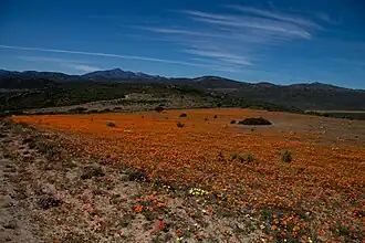 Namaqua National Park is a South African national park situated on the edge of the Atlantic coast of Namaqualand (an area covering 440,000 km2 located within the semi-desert Succulent Karoo biome).[2][3] This biome is a biodiversity hotspot with the largest concentration of succulent plants in the world.[3] The park also has an arid environment with succulent plants.[4] The park was created to protect its endemic flowers.[5] During the spring, wildflowers bloom there in a spectacular fashion.[3] The park's main tourist attraction is this abundant spring bloom of brightly coloured wildflowers.[4][6]