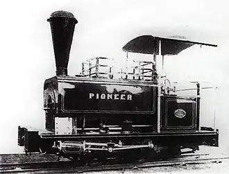 The Namaqua Copper Company acquired its first steam locomotive from Dick, Kerr & Company in 1901. It was named Pioneer and was constructed as a wood-burning 0-4-0ST locomotive with a balloon chimney which contained a spark arrester. The locomotive had a fuel rack mounted on top of the tank, ahead of the cab.[1]