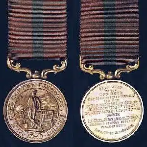 The Second Boer War ended with the signing of the Treaty of Vereeniging in Pretoria on 31 May 1902. When it later transpired that the coloured members of the O'okiep garrison were excluded from receiving the Queen's South Africa Medal, the Cape Copper Company struck a medal of its own and presented it to all the defenders, regardless of race. The obverse of the Cape Copper Company Medal for the Defence of O'okiep depicts a miner with a spade, standing next to an ore truck.[2]