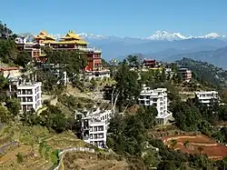 Namo Buddha (Nepali: नमोबुद्ध, "Namo", Hommage; "Buddha", to the Buddha) or Takmo Lüjin (Tib. སྟག་མོ་ལུས་སྦྱིན་, Wyl. stag mo (tigress) lus sbyin (body giving)) is located in a municipality in Kavrepalanchok District of Bagmati Province of Nepal,[1] 52 km southeast of Kathmandu. Namo Buddha is named after the self-sacrifice by an early incarnation of Shakyamuni Buddha, performed to save the lives of a tigress and her cubs.[2] The Namo Buddha Stupa houses his bone relics and is considered one of the three most important pilgrimage sites and main stupas in the Kathmandu Valley.[3][2]