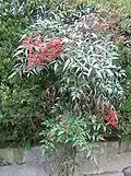N. domestica, grown in Chinese and Japanese gardens for centuries, was brought to Western gardens by William Kerr, who sent it to London in his first consignment from Canton, in 1804.[5] English breeders, unsure of its hardiness, kept it in greenhouses at first. The scientific name given to it by Carl Peter Thunberg is a Latinized version of a Japanese name for the plant, nan-ten.[5] Over 65 cultivars have been named in Japan, where the species is particularly popular and a national Nandina society exists. In Shanghai berried sprays of nandina are sold in the streets at New Year, for the decoration of house altars and temples.[5]