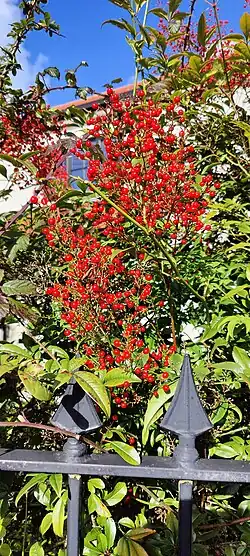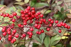 Nandina is considered invasive in Texas, North Carolina, Tennessee, Georgia, and Florida.[17] It was placed on the Florida Exotic Pest Plant Council's invasive list as a Category I species, the highest listing. It has been observed in the wild in Florida in Gadsden, Leon, Jackson, Alachua and Citrus counties, in conservation areas, woodlands and floodplains.[18] In general, the purchase or continued cultivation of non-sterile varieties in the southeastern United States is discouraged.