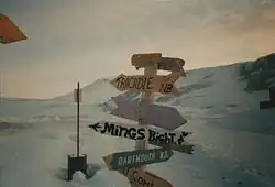One of three signposts in Nanisivik showing directions to various cities and towns