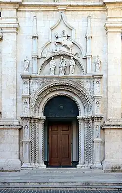 In 1432–1435 he worked on the main entrance portal for the Basilica of Saint Nicholas of Tolentino, with an architectural framework that is "a strange mixture of Romanesque and Gothic motifs",[23] not to mention classicizing Renaissance ones, with sculptures of Saint George and the Dragon above the Virgin and Child flanked by two saints. At each side, a saint or prophet stands singly at each of four levels. The Saint George seems to draw on a classical model.[24]