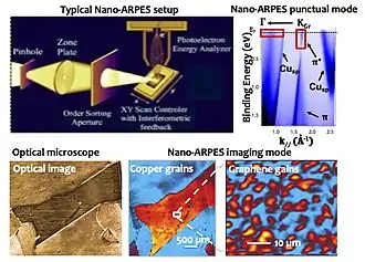 The photon beam focusing to a spot size down to nanometric scale has been routinely achieved in a few well-known X-ray-based methods, such as scanning transmission X-ray microscopy (STXM) and scanning photoemission microscopy (SPEM).[11] However, these techniques are much less demanding because they typically use incident photon energies higher than 150 eV and require non-angle resolved measurements, only recording integrated signals proportional to the X-Ray absorption coefficient and core-level photoelectrons, respectively. In both cases, the Fresnel Zone Plates (FZPs) performance is the essential component determining the lateral resolution, varying from micro- to nanometric lateral resolution. Nowadays, several companies in the market provide FZPs with a resolution better than 30 nm, which has facilitated the construction and operation of several x-Ray based microscopes such as STXM and SPEM instruments in different synchrotron radiation facilities like Elettra, ALS, CLS,[12] and MAX-lab,[13] among others. Nano-ARPES technique, however, requires much lower incident photon energy, typically from 6 eV to 100 eV) to detect those photoelectrons emitted by the electronic states below and close to the Fermi level, which cross-section increases as the incident photon energy decreases.[14][15] An alternative k-space imaging approach is based on energy-filtered photoemission microscopes (PEEMs), The lateral resolution is achieved using an electron optical column instead of focalizing the incident photon beam. This full-field k-space version of PEEM is available commercially. However, for this commercially available full-field PEEM version with k-space imaging, achieving high energy and momentum resolution is challenging.[16]