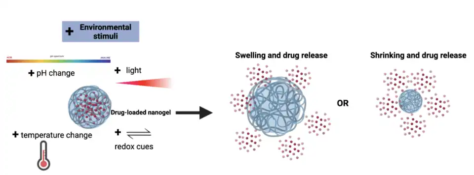Nanogels that respond to various stimuli including changes in pH and temperature or the presence of redox and light cues have proven to be useful tools for drug delivery. One such responsive nanogel was designed to switch from a surface negative charge to a surface positive charge upon exposure to decrease in pH once inside a tumor.[28] When loaded with a chemotherapeutic agent, this technology induced a lower viability in 3D tumor spheroids compared to control groups.[28] Another type of nanogel loaded with osteoarthritis anti-inflammatory drugs was found to significantly increase the amount of drug transported after topical application to the skin and exposure to its natural elevated temperature.[29] One group reported a method to control the release rate of an antiplatelet medication from a nanogel by using UV light to alter the crosslinking density of the polymer and subsequently change the swelling rate.[30] Additionally, other nanogels have been synthesized to include disulfide cleavable polymers that respond to reductive cues in the surrounding environment.[31] One such nanogel was loaded with a chemotherapeutic agent and demonstrated a decrease in cell viability compared to a free version of the same agent.[31]