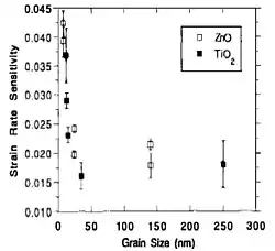 2), has been shown to have increased hardness and ductility at the nanoscale. In an experiment, grains of titanium dioxide that had an average size of 12 nanometers were compressed at 1.4 GPa and sintered at 200 °C.[5] The result was a grain hardness of about 2.2 times greater than that of grains of titanium dioxide with an average size of 1.3 micrometers at the same temperature and pressure.[5] In the same experiment, the ductility of titanium dioxide was measured. The strain rate sensitivity of a 250 nanometer grain of titanium dioxide was about 0.0175, while a grain with size of about 20 nanometers had a strain rate sensitivity of approximately .037; a significant increase.[5]