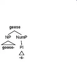 Distributed Morphology attempts to tackle the question through the process of fusion. Fusion is the process in which a noun head and its numeral head may fuse together under certain parameters to derive an irregular plural.[11] In the above example, the plural of “duck” would simply select its plural allomorph “ducks”, and the plural of “goose” would select its plural allomorph “geese”, created through the fusion of “goose” and “-s”. In this way, distributed morphology is head-based. However, this theory still does not provide a reason as to why "geese" is preferable and a more optimal candidate for a plurality of geese over "gooses".
