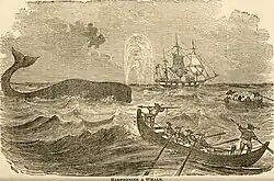 Various ancillary industries on Nantucket such as shipbuilding and spermaceti processing also emerged to support the growth of this new burgeoning island economy. Recognizing their fortunate geographic location and in need of a good living, large numbers of these early settlers began to hunt sperm whales by the early 1700s. Herman Melville wrote in Moby Dick that "thus have these Nantucketers overrun and conquered the watery world like so many Alexanders."[4] By the time the American Revolution began in 1775, the island had become the premier whaling economy on the Eastern Seaboard and had developed into a crucial trade partner for the British Empire across the Atlantic.[3]