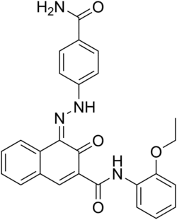 In the solid state the hydrazo tautomer forms and several crystal structures exist. In the initial α polymorph the molecules are arranged in a herringbone pattern with extensive hydrogen bonding. The φ polymorph is more dense and more stable and produced industrially by thermal treatment in water at 130°C under pressure. In this phase the molecules are planar and arranged in layers. Extensive hydrogen bonding exists within the layer but between layers the only interactions are Van der Waals forces. Dense crystal structures are preferred for pigments used in coatings because in the event of photochemical decomposition the fragments are locked in place and are able to recombine. Research shows that by replacing the ethoxy group in this compound by a methoxy group the crystal structure is less stable and in the final application and the color fades more easily. By careful selection of substituents it is possible to optimize crystal structure and improve optical properties [1].