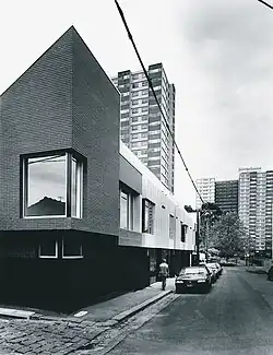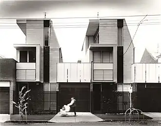 The personnel involved in the project include Kerstin Thompson, Michael Archibald and Simone Koch. The design includes eleven dwellings and each one includes a generous roof terrace and flexible options for occupation. The terraces are arrested at two corners by brick skillions, which, along with the use of materials, create a sense of continuity within the design. Running parallel to the rear of the terraces, four dwellings are arranged in two serial lines of extruded three-storey volumes.[2] Large brick faces hover over the street, giving a visual connection to the larger brick forms beyond. The return sides of the radically sloping brick walls reconnect them to the scale of the five intervening terraces. On the lane-way corner, this system is reversed so that the terraces contrast in height to the reversed inclination of the skillion. The project is surrounded at street level by fine-gauge steel fencing which protects small threshold gardens at each dwelling's entry.