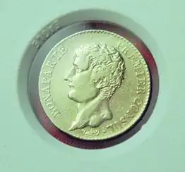 They were issued during the reign of Napoleon I and feature his portrait, sometimes bare headed and other times wearing a laurel wreath (the ancient Roman symbol of imperial or military glory) and, depending upon the political status of France, the words on the front: either Bonaparte – Premier Consul (First Consul) or Napoléon Empereur (emperor). On the back: the legends read either "RÉPUBLIQUE FRANÇAISE" (French Republic) or after 1809, "EMPIRE FRANÇAIS" (French Empire). There was even a 20 and 40 Lire Napoleon minted under the auspices of the Kingdom of Italy, a client state. "Bonaparte First Consul" pieces of similar size, weight and fineness were struck at the Turin Mint. The obverse (L'Italie Délivrée à Marengo]) recounts that Italy was liberated[9] from Austria by Bonaparte at Marengo, Piedmont on 14 June 1800, whereat the French General Louis Desaix was killed. The reverse indicates the extent liberated lands, known as Gaul Subalpine, Eridania or Northern Italy. The type was created pursuant to the decree of the Gaul Subalpine government established after the Battle of Marengo and which existed from 16 June 1800, through 11 September 1802.[10]