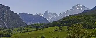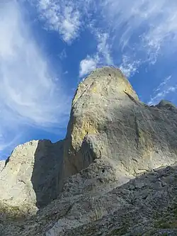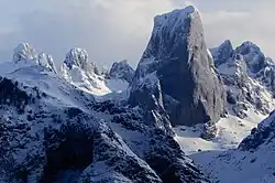 The Naranjo de Bulnes (known as Picu Urriellu in Asturian) is a limestone peak dating from the Paleozoic Era, located in the Macizo Central region of the Picos de Europa, Asturias (Spain). Its name Picu Urriellu is believed to be derived from the term Los Urrieles, which is used to describe the Macizo Central. Naranjo de Bulnes is part of the Cabrales region of Asturias, and lies within the Picos de Europa National Park.