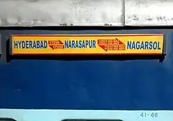 The train departs from Hyderabad at 21:45 hours and arrives in Narasapuram at 08:40 hours the next day. From Narasapuram, train departs at 18:55 hours and arrives in Hyderabad at 05:25 hours the next day. Train run with 6 air-conditioned coaches. The train operates daily and covers a distance of 461 km, via Gudivada, Vijayawada, Guntur, Nalgonda. This train is full entire year still South Central Railway (SCR) didn't provide more trains in this route. The Rake is shared by Narasapur–Nagarsol Express
