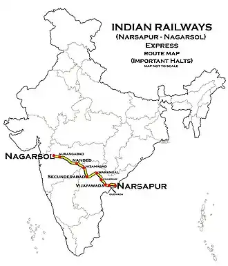 The 12787/ 88 Narasapuram Nagarsol superfast Express runs from Narasapuram via Bhimavaram Town, Vijayawada Junction, Warangal, Kazipet Junction, Secunderabad Junction, Nizamabad Junction, Hazur Sahib Nanded, Parbhani Junction, Jalna, Aurangabad to Nagarsol.