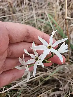 Narcissus elegans is commonly found in scrublands and long-abandoned fields. It can be distinguished from Narcissus serotinus by several key characteristics: N. elegans typically has multiple flowers in its inflorescence and develops leaves concurrently with flowering, whereas N. serotinus does not have leaves during its flowering period. Additionally, the leaves of N. elegans are flat, contrasting with the cylindrical leaves of N. serotinus. The flowers of N. elegans are white with an orange central corona; the petals are notably narrow and sometimes curve backward. This species blooms in the autumn.[3]