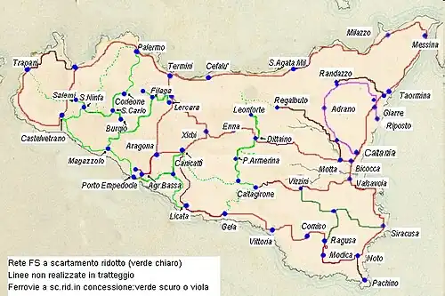 Sicily had at one time an extensive narrow gauge railway network. The design work was begun under at the time of the provisional management of the Southern Railways, continued by the Rete Sicula (Sicilian Railways) and built by Ferrovie dello Stato (Italian State Railways),[1] which spread over the territory of five provinces: Palermo, Trapani, Agrigento, Caltanissetta, Enna; today the FS narrow-gauge network is completely abandoned and only the Circumetnea railway survives.