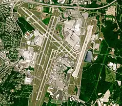 Nashville International Airport (IATA: BNA, ICAO: KBNA, FAA LID: BNA) is a public/military airport in the southeastern section of Nashville, Tennessee, United States. Established in 1937, its original name was Berry Field, from which its ICAO and IATA identifiers are derived. The current terminal was built in 1987, and the airport took its current name in 1988. Nashville International Airport has four runways and covers 4,555 acres (1,843 ha) of land.[4][5] It is the busiest airport in Tennessee,[6] with more boardings and arrivals than all other airports in the state combined.