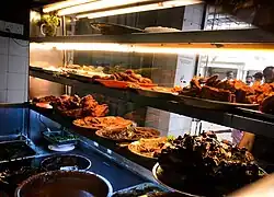 The rice for a nasi kandar dish is often placed in a wooden container about three feet high, giving it a distinctive aroma. The rice is accompanied by lauk-pauk (side dishes) such as ayam goreng, assortment of kari (curry) like kari daging (beef), kari limpa (beef spleen) and kari kambing (mutton); telur ikan, udang goreng or sotong goreng.[6] The vegetable dish would usually be terung (brinjals), bendi (okra) or peria (bitter gourd). A mixture of curry gravies are poured on the rice. This is called banjir ("flooded") and imparts a diverse taste to the rice.