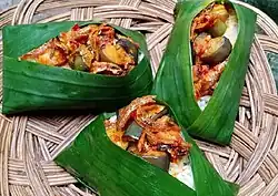 Main ingredientsRice in small portion with various side dishes wrapped inside banana leaf