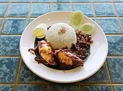 Nasi lemak, a similar dish of Malay origin common in the Malay peninsula and Sumatra