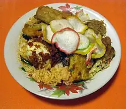 Nasi uduk (from Javanese nasi wuduk; Javanese script: ꦤꦱꦶ​ꦮꦸꦢꦸꦏ꧀) is an Indonesian-style steamed rice cooked in coconut milk dish, especially popular in Betawi and Javanese culinary traditions.[1][2]