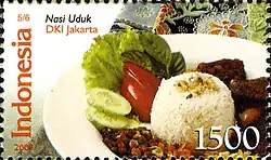 Nasi uduk depicted in Indonesian stamp as a dish from Jakarta