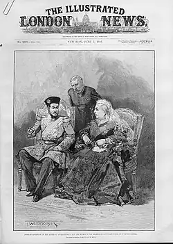 On 27 May 1895 the Shahzada was received by the Queen at Windsor.[4] During his trip he also visited the Liverpool Overhead Railway, and went to Ascot, Glasgow, and the Elswick Company Gun Range at Blitterlees Banks,[5] as well as staying with Lord Armstrong at Cragside.[6] He made a gift of £2,500 to Abdullah Quilliam to support the work of the Liverpool Muslim Institute.