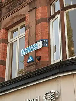 Formerly known as St Patrick's Well Lane after a 12th-century well, it was renamed in the 18th century, after the accession to the throne of King William III, a member of the House of Orange-Nassau.[1] To emphasise the point, one of the houses erected a marble bust of William with the couplet: