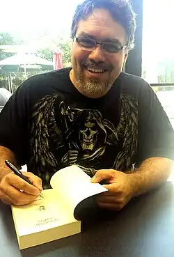 According to his personal bio, he has held many jobs over the years before becoming an author,[1][3] including pizza maker,[1] radio DJ,[1] Catholic seminarian,[1][3] police officer,[1][3] and software engineer,[1][3] his current profession.[1][3] He also holds a degree in Philosophy and a black belt in Tang Soo Do.[1][3]