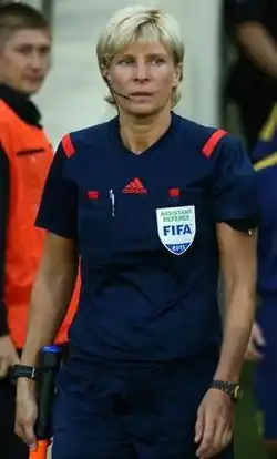 Natalia Volodymyrivna Rachynska (Ukrainian: Наталія Володимирівна Рачинська; born 14 August 1970) is a retired Ukrainian assistant football referee. She was the first female referee in a Ukrainian Premier League.[1][2][3][4][5][6][7] Rachynska was selected to become a referee at UEFA Women's Euro 2013.[8] She was previously also a professional football player.[1]