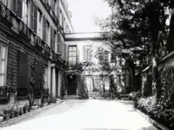 In the 1900s Barney held early gatherings of the salon at her house in Neuilly. The entertainment included poetry readings and theatricals (in which Colette sometimes performed). Mata Hari performed a dance once, riding into the garden naked as Lady Godiva on a white horse harnessed with turquoise cloisonné.[78] The play Equivoque may have led Barney to leave Neuilly in 1909. According to a contemporary newspaper article, her landlord objected to her holding an outdoor performance of a play about Sappho, which he felt "followed nature too closely".[79] She canceled her lease and rented the pavilion on Rue Jacob in Paris's Latin Quarter, and her salon was held there until the late 1960s. This was a small two-story house, separated on three sides from the main building on the street. Next to the pavilion was a large, overgrown garden with a Doric "Temple of Friendship" tucked into one corner. In this new location, the salon grew a more prim outward face, with poetry readings and conversation, perhaps because Barney had been told the pavilion's floors would not hold up to large dancing parties.[80][81] Frequent guests during this period included poets Pierre Louÿs and Paul Claudel, diplomat Philippe Berthelot and translator J. C. Mardrus.[82]