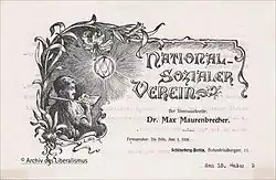 The National-Social Association (German: Nationalsozialer Verein, NSV) was a political party in the German Empire, founded in 1896 by Friedrich Naumann. It sought to synthesise liberalism, nationalism and non-Marxist socialism with Protestant Christian values in order to cross the ideological front lines and draw workers away from Marxist class struggle. However, it never grew beyond a minor party of intellectuals which failed to gain mass support in elections.[3]