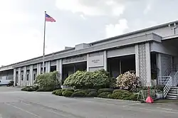 The General Services Administration opened a records center at the Sand Point Naval Air Station in 1951, serving as Seattle's branch of the National Archives.[12] The Seattle branch was upgraded to a federal records center in August 1953 and moved five times prior to the establishment of the permanent facility.[13] The new facility near Sand Point was located in a 59,000-square-foot (5,500 m2) Navy warehouse that was built in 1949 and underwent extensive renovations that cost $397,000.[14][15] It was dedicated as the Federal Archives and Records Center on November 16, 1963, in a ceremony that included speeches from Governor Albert D. Rosellini and U.S. senators Henry M. Jackson and Warren G. Magnuson, who praised the facility as "one of the finest centers in the nation".[16] By 1969, the Seattle Federal Records Center had grown to 170,000 cubic feet (4,800 m3) of material and 18 full-time employees.[17] A portion of the collections was destroyed in a fire in 1974.[15]