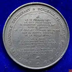 Numismatic reference of the first decisions of the National Assembly at the Grand Théâtre de Bordeaux in February and March 1871, obverse and reverse.