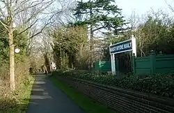 The section of route 61 from St Albans to Hatfield is known as the Alban Way.[4] It is a former railway line. Just after the route pass the former London Road station, it goes under the Midland Main Line and then reaches a zig-zag cycle route up the hill to St Albans City station. At Nast Hyde, Hatfield, a local resident has restored the former station platform sign and provided information about the former railway.