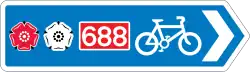 ![]() A typical Route 688 sign showing the Way of the Roses red and white roses, a direction arrow and route number | |