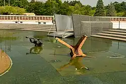 According to the National D-Day Memorial Foundation, the memorial is a continuum of three distinct plazas which follow on a time line. The first plaza, Reynolds Garden, symbolizes the planning and preparation activities for the invasion through the execution of the order for the invasion. It is in the shape of the Supreme Headquarters Allied Expeditionary Force combat patch. The second level, Gray Plaza, reflects the landing and fighting stages of the invasion. It includes what is called the invasion pool with beach obstacles in the water, sculptures of soldiers struggling ashore, and a representation of the Higgins craft used for the invasion. This section includes intermittent jets of water spurting from the pool replicating the sights and sounds of sporadic gunfire. The names of the United States' losses appear on the west necrology wall of the central plaza, the rest of the Allies' losses on the east necrology wall. In the spirit of Dwight D. Eisenhower's one-team command philosophy for the SHAEF, no other distinctions are made.[1] The last and uppermost plaza, Estes Plaza, celebrates victory and includes the Overlord Arch and the twelve flags of those Allied nations that served in the Allied Expeditionary Force. The Overlord Arch represents the victory of Operation Overlord and bears the invasion date of June 6, 1944 in its height at 44 feet (13 m) and 6 inches (150 mm) tall.[1]