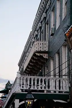 The building's facade is divided into sections that alternate wide and narrow. Cast iron framed balconies extend from the wide sections of the third story[5] and feature Classical Revival[3] railings and brackets made of ornamental iron. The second story features a wood-column-supported balustraded veranda that runs the entire width of the building and extends over a "handsome" wood portico and the sidewalk below. The first floor consists of offices, shops, and two entrances: one to the hotel's dining room and another to a stairway that leads to the hotel lobby on the second floor.[1][5]