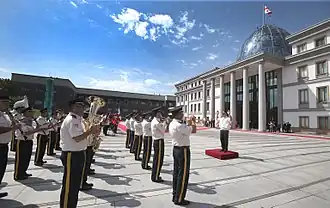 The first military parade of the guard with the participation of the First and Second Guards Brigades was held at Boris Paichadze Stadium on 30 April 1991, where for the first time after 70 years, Georgians swore allegiance to their homeland. Gamsakhurdia personally read the oath of allegiance to the guards.[3] The parade was led by Colonel Avtandil Tskitishvili, and saw a small detachment of cavalry being paraded. Colonel Gogi Papavadze (Head of the Main Division of the National Guard) was then presented the new flag of the guard by the parade commander.[3] This day is today commemorated as Defence Forces Day.[4]