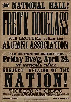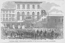 National Hall is a former venue in Philadelphia, Pennsylvania, located at 1222–24 Market Street, between Twelfth and Thirteenth Streets. It was one of the most popular venues in the city, site of concerts, lectures, meetings, and political speeches. It opened on January 8, 1856, with a "grand operatic concert".[1] While it existed, from 1856 to 1873, it was the main venue in Philadelphia for speakers for abolitionism and other progressive causes.