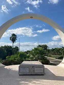 Sir Alexander Bustamante is honored with a memorial completed in October 1979. Designer Errol Alberga created an arch, narrow at the top and widening toward the base, which stands above Bustamante's tomb, finished with marble from the region.[9] Seats are incorporated into the base of the arch, which spans a gap of thirty feet.[10]