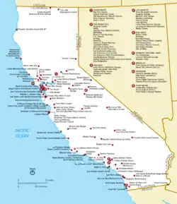 The table below lists all 150 sites, along with added detail and description. The sites are distributed across 36 of California's 58 counties.[2]