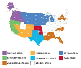 The commission provides federal oversight to more than 510 tribally owned, operated or licensed gaming establishments operating in 29 states. The commission maintains its headquarters in Washington, D.C., and has eight regional offices located in Portland, Oregon; Sacramento, California; Phoenix, Arizona; St. Paul, Minnesota; Tulsa, Oklahoma; Oklahoma City, Oklahoma; Rapid City, South Dakota; and Washington, D.C.