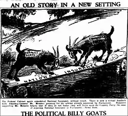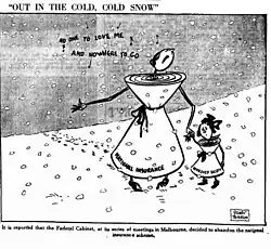 In September 1928, Page introduced the National Insurance Bill into the House of Representatives, which "provided for sickness, old age, disability and maternity benefits, mainly paid for by compulsory contributions by workers and employers, along with smaller payments to parents of children under 16 and to orphans".[9] The legislation failed to pass before the 1928 federal election, although the government heavily promoted the scheme during the election campaign. The scheme was postponed indefinitely the following year, prior to the government's parliamentary defeat on a no-confidence motion and defeat at an early election.[10]