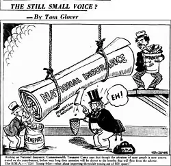 The government's legislation was largely modelled on its British equivalents and was drafted by British civil servants.[12] However, unlike in the UK, administrative control over the scheme was to be vested in a National Insurance Commission. Its final form was largely due to financial considerations, with the legislation required the scheme to become self-financing as soon as possible.[13] It ultimately included contributory schemes for sickness and disability, old-age pensions, payments for widows and orphans, and child endowment.[14] Many specialist medical services were excluded from the scheme, including anaesthesia, pathology, x-rays, venereal diseases, abortions, miscarriages and stillbirths.[15] The health and pension insurance components (known as the Kinnear scheme after their author) were to be enacted separately to the unemployment insurance component.[12]