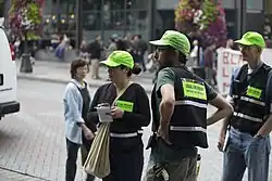 National Lawyers Guild legal observers, in trademark green hats, at a Solidarity Against Hate demonstration in Seattle.