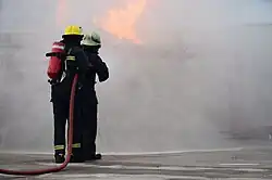 Students carrying out fire-fighting exercise.
