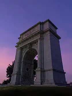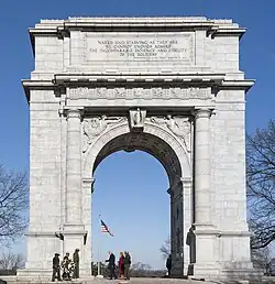The National Memorial Arch is a monument located in Valley Forge National Historical Park of Upper Merion Township, Pennsylvania. The memorial arch honors the arrival of General George Washington and the Continental Army at Valley Forge, which was the site of their military camp during the winter of 1777–78. Construction on the structure began in 1914 and it was dedicated in 1917.
